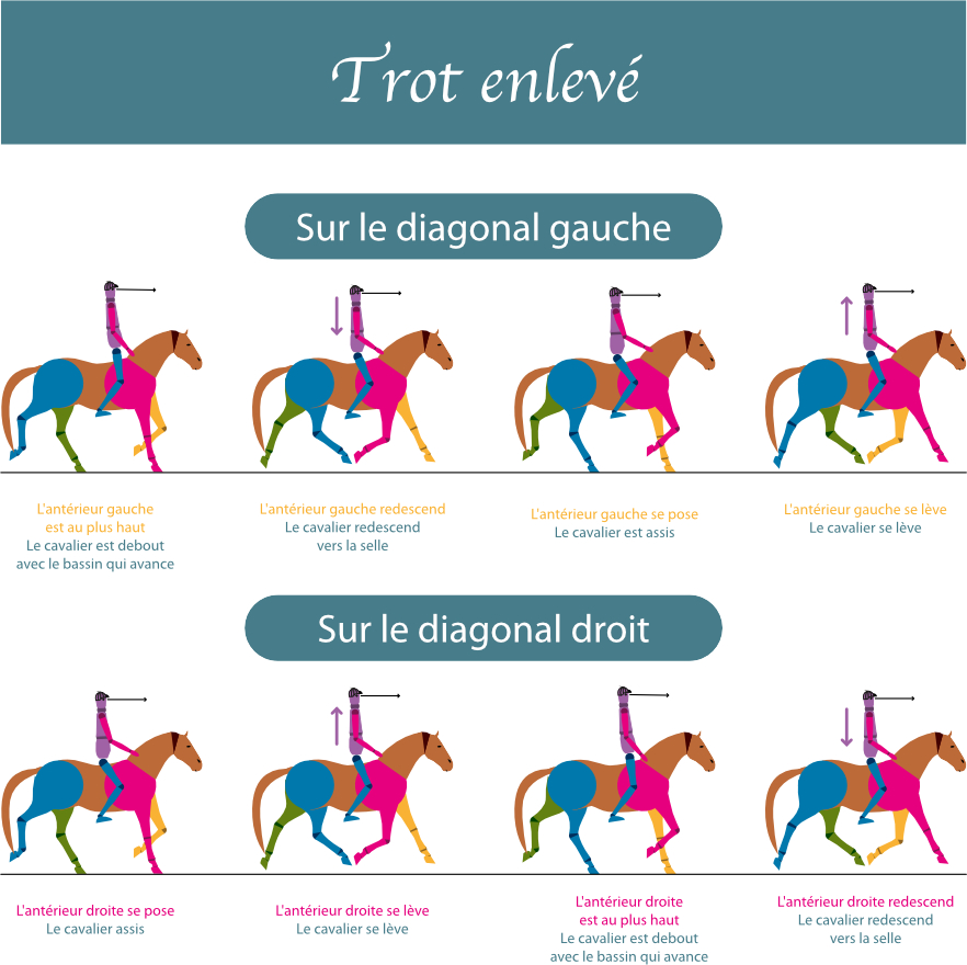 Le cavalier va se lever et redescendre de sa selle en rythme avec le cheval. Cette façon de faire, évite les à-coups sur le dos du cheval. On a beau avoir un amortisseur et une selle, cela peut quand même faire du mal au cheval à force de répétition.