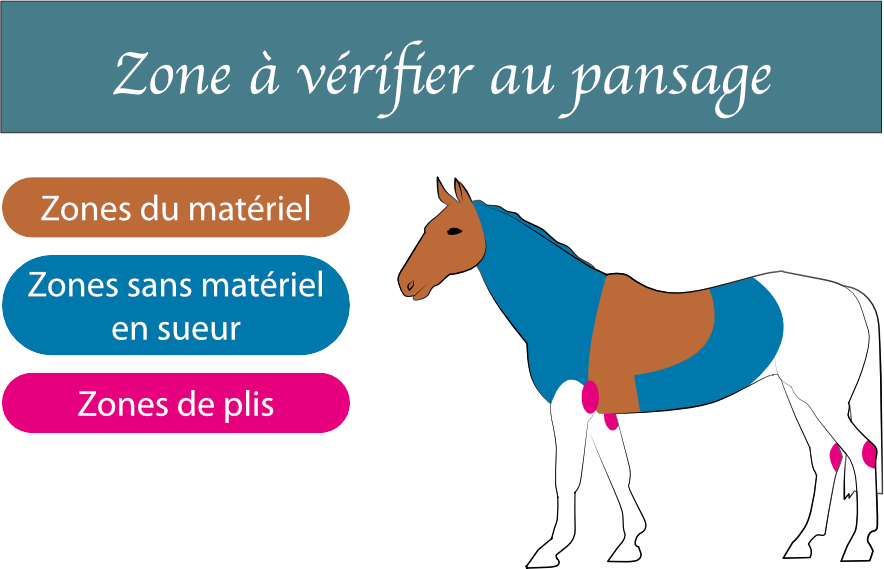 Ensuite, vous vérifiez l’état du poil sur les zones en sueur qui n’ont pas supporté de matériel. Cela concerne l’encolure, les épaules, les flancs mais également les plis au niveau des membres antérieurs. Cette dernière zone garde très facilement la poussière. Et enfin, le coude au niveau des membres postérieurs. J’ai remarqué que cette zone était souvent sale sans que je parvienne à l’expliquer. Un manque de brossage ? Un poil un peu particulier ? Je ne sais pas.