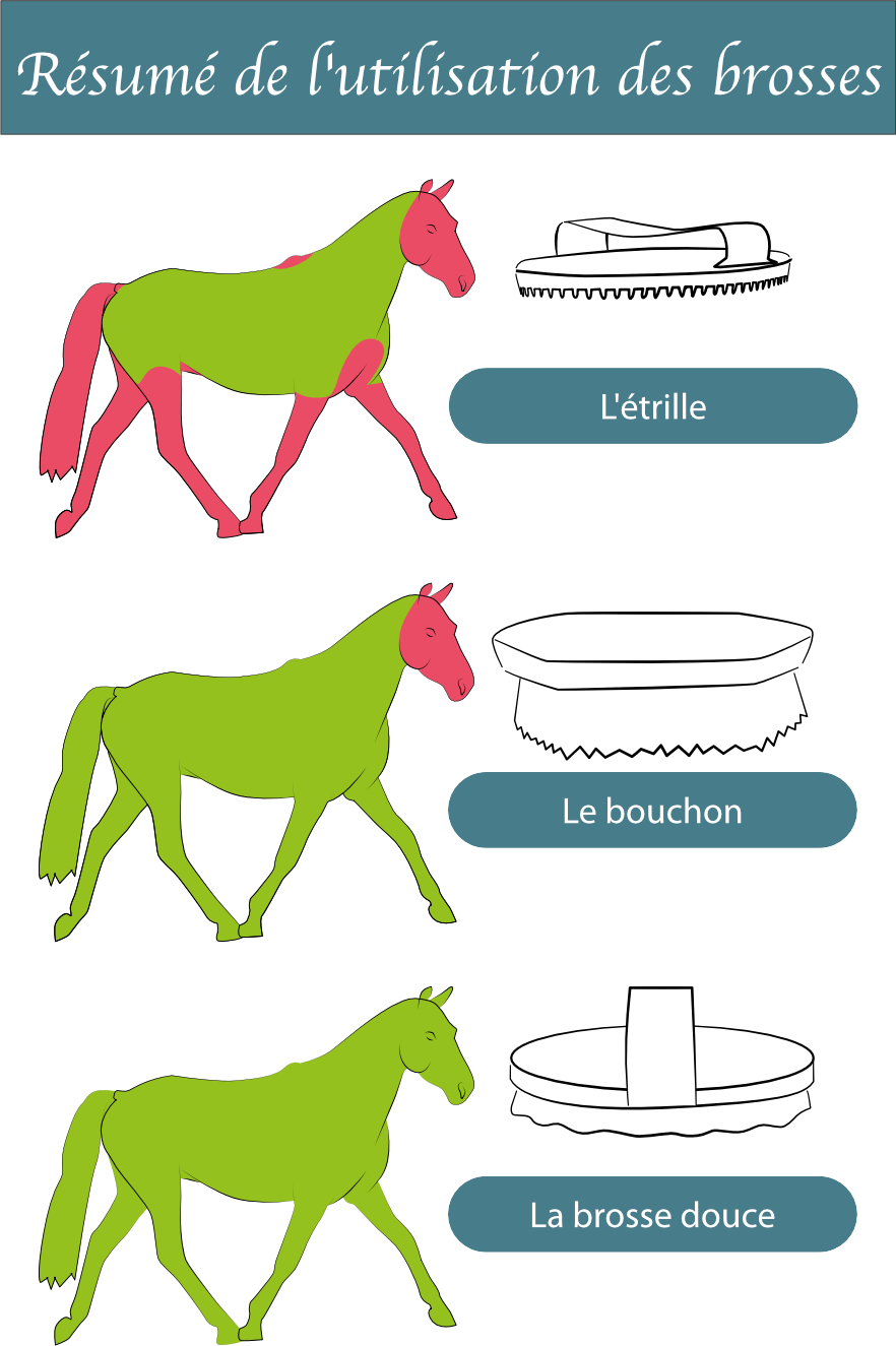 Gardez la même routine de pansage qu’à la préparation. L’article sur la préparation était « Le meilleur des pansage ». Pour résumer, vous passez l’étrille puis la brosse dure et enfin la brosse douce.