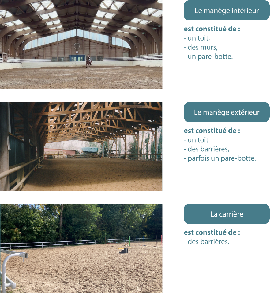 Le manège extérieur : Vous retirez les murs, et le plus souvent les pare-bottes, vous gardez juste le toit.  Cet espace est délimité par des barrières appelées « lices ».