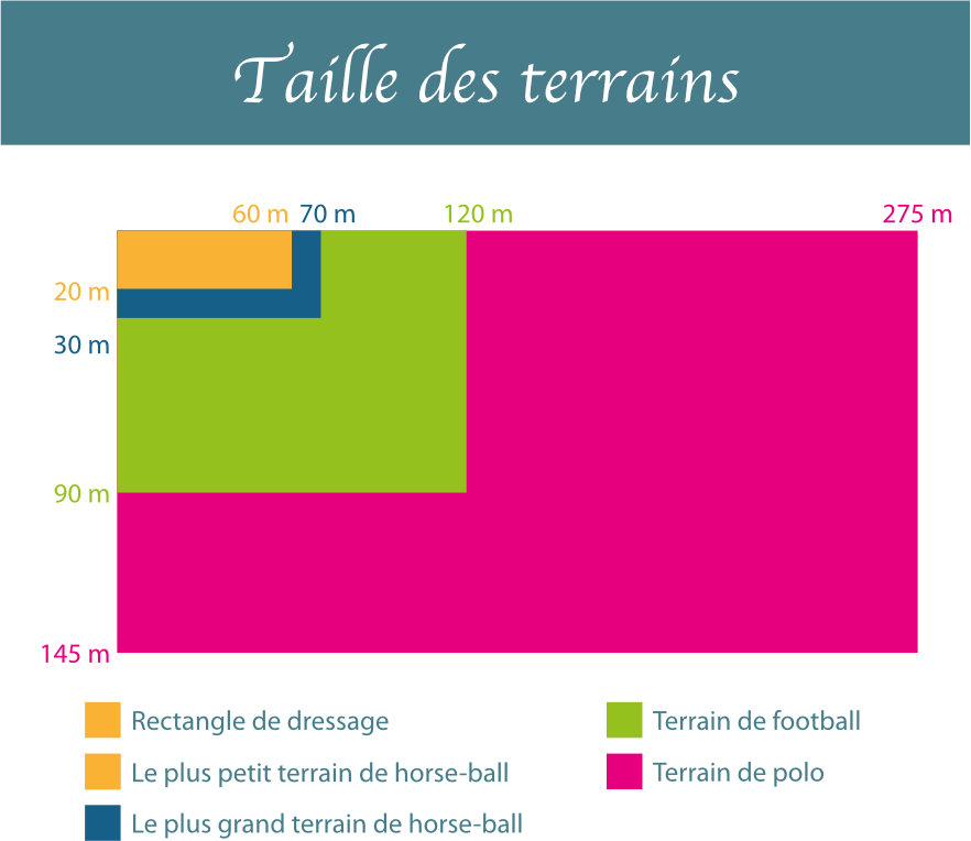 La taille des terrains n’est pas fixe afin de pouvoir accueillir plusieurs disciplines équestres. Il existe trois disciplines qui nécessitent la délimitation d’un terrain. La différence de taille entre les terrains est surprenante. Regardez sur le schéma les proportions !