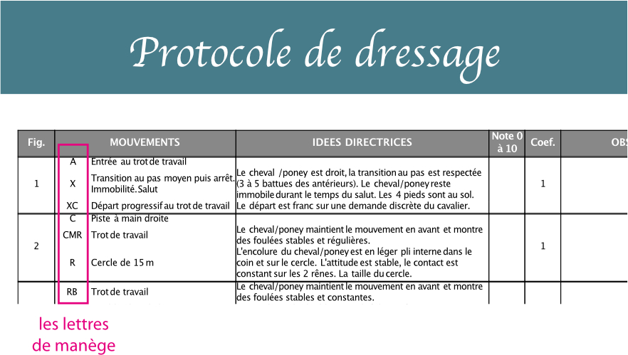En reprise de dressage, la précision du tracé est importante. Vous entendrez souvent l’expression : « être à la lettre ». Cela signifie que le cheval doit effectuer un exercice à un endroit précis du manège. Les juges notent l’endroit où l’exercice est effectué. Pour en finir avec les lettres, elles sont utilisées sur les protocoles de dressage. Ce sont des exercices, nommés en dressage « reprises » avec figures imposées dans un ordre précis, décrit dans un protocole : on les nomme « reprises imposées » . Si l’ordre des figures n’est pas imposé, on les nomme « reprises libres » , et si on ajoute de la musique sur cette dernière, on parle de « RLM » c’est à dire : Reprise Libre en Musique. Lors des concours de dressage, tous les cavaliers effectuent la même reprise imposée. C’est la meilleure réalisation qui est alors récompensée. Pour la RLM, comme son nom l’indique, l’ordre des figures n’est pas imposé, seule leur réalisation l’est, dans l’ordre que vous désirez et en accord avec la musique.