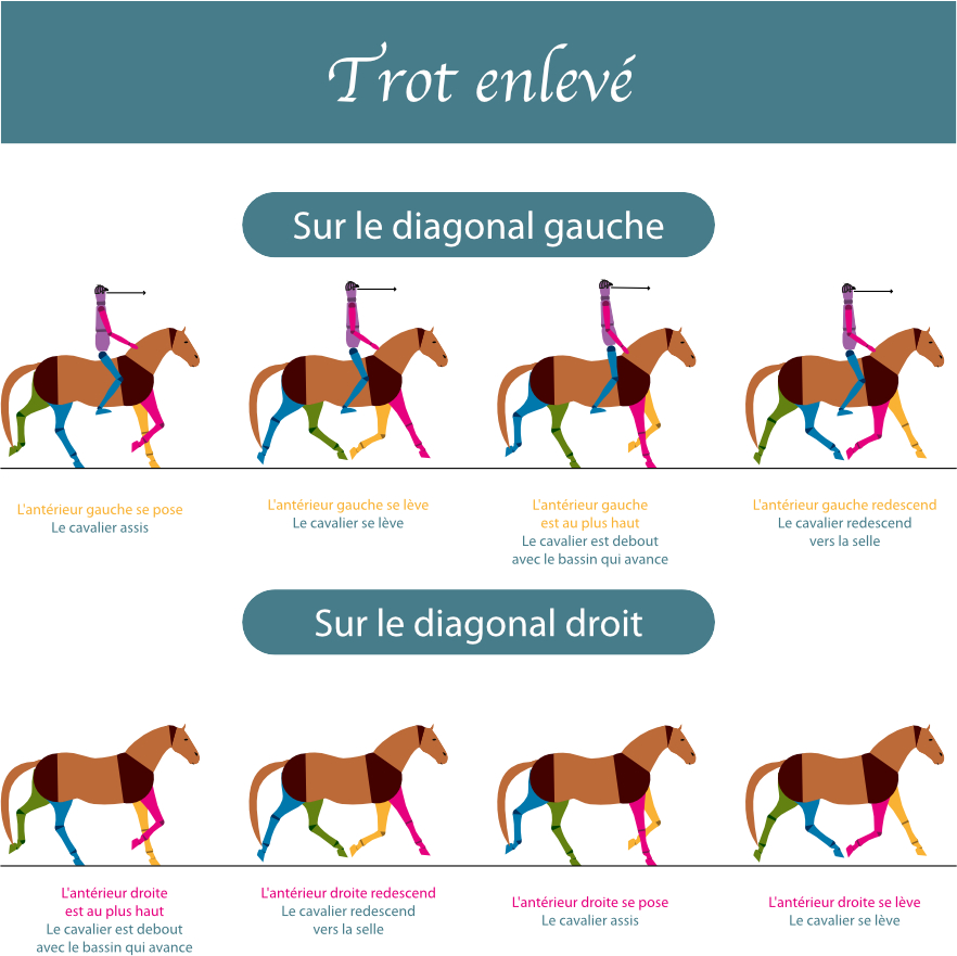 Le cavalier va se lever et redescendre de sa selle en rythme avec le cheval. Cette façon de faire, évite les à-coups sur le dos du cheval. On a beau avoir un amortisseur et une selle, cela peut quand même faire du mal au cheval à force de répétition.