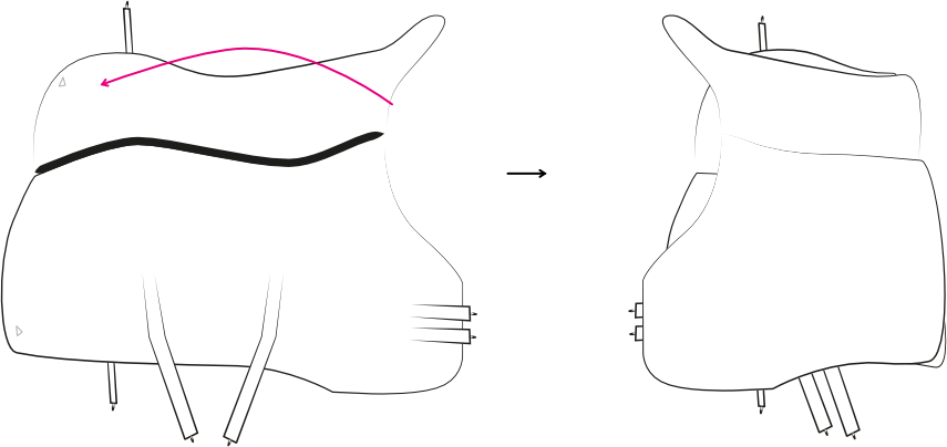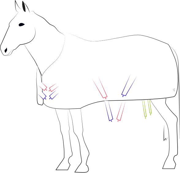 Se positionner à gauche du cheval pour accéder aux attaches. Ajuster la couverture pour éviter que le cheval ne s'étouffe lorsque les attaches du poitrail seront fermées.
